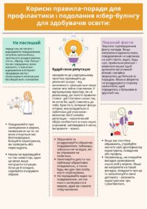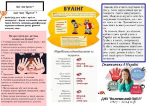Протидія булінгуПередбачає профілактичні заходи, такі як просвітницька робота та формування толерантної атмосфери, а також оперативне реагування на випадки булінгу шляхом повідомлення адміністрації та залучення психологічної служби Булінг 2024-2025 Булінг 2024-2025Завантажити Алгоритм взаємодії щодо превенції та протидії булінгу в закладах освіти Алгоритм протидії булінгу в закладах освітиЗавантажити Заходи булінг на 24_25н.р. Заходи булінг на 24_25н.р.Завантажити Протидія булінгу. Практичні рекомендації БуклетиЗавантажити Click to open Click to open