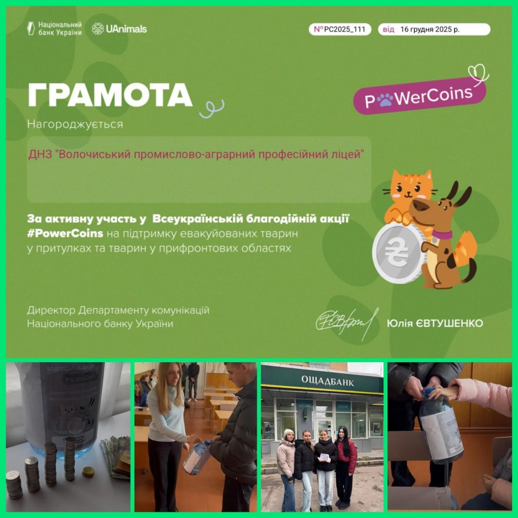 Учасники освітнього процесу ДНЗ «Волочиський промислово-аграрний професійний ліцей» долучилися до благодійної ініціативи PowerCoins, організованої Національним банком України спільно з UAnimals. Зібрані монети покращать життя тварин, які постраждали від війни, а також допоможуть створити та розширити кількість безпечних місць у притулках.