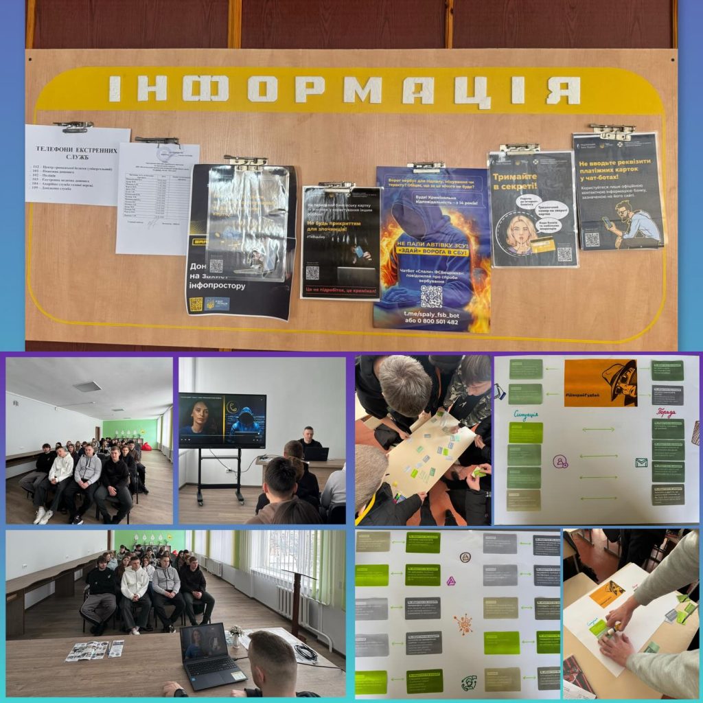 Студенти прослухали курс «Шахрай Гудбай», після чого закріпили знання у форматі практичного завдання: створили інформаційний плакат, де до змодельованих ситуацій підібрали відповідні картки з порадами щодо безпечної поведінки в онлайн-просторі.