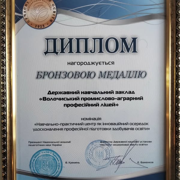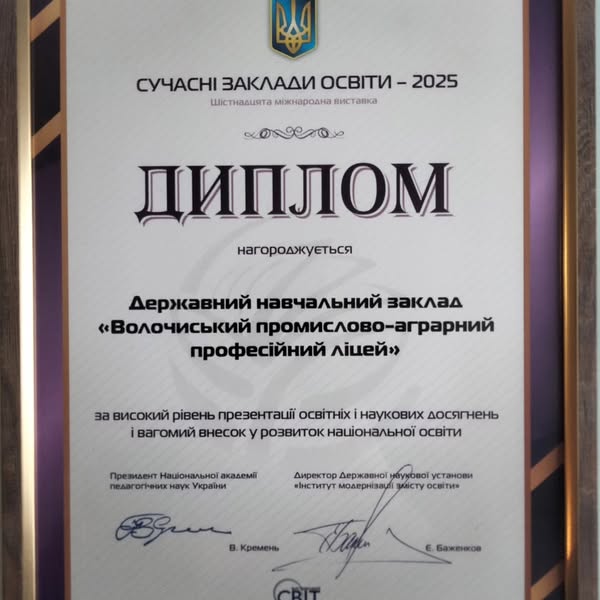 Голова Хмельницької обласної військової адміністрації Сергій Григорович ТЮРІН відзначив Державний навчальний заклад “Волочиський промислово-аграрний професійний ліцей” дипломом “За високий рівень презентації освітніх і наукових досягнень і вагомий внесок у розвиток національної освіти” та бронзовою медаллю у номінації “Навчально-практичний центр як інноваційний осередок удосконалення професійної підготовки здобувачів освіти” за підсумками шістнадцятої міжнародної виставки “Сучасні заклади освіти 2025”